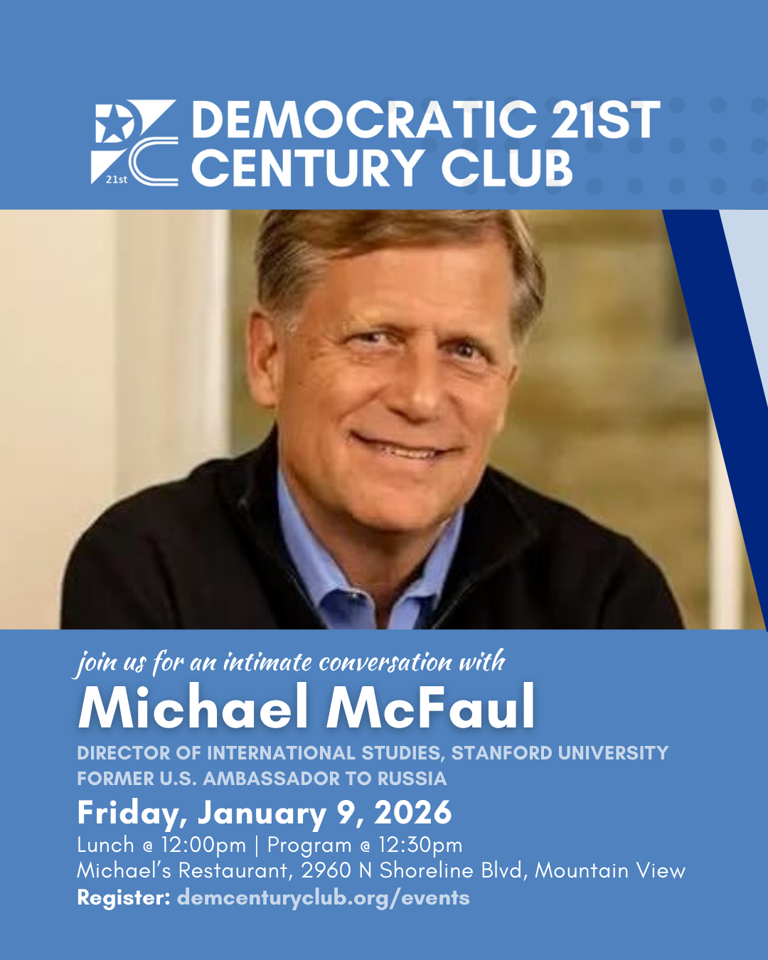 We invite you to join us for a special program to kick off the new year featuring a conversation with Michael McFaul, former U.S. Ambassador. Mr. McFaul currently serves as Director of the Freeman Spogli Institute for International Studies, the Ken Olivier and Angela Nomellini Professor of International Studies at the Department of Political Science, and Peter and Helen Bing Senior Fellow at the Hoover Institution, all at Stanford University. He is also an international affairs analyst for NBC News.